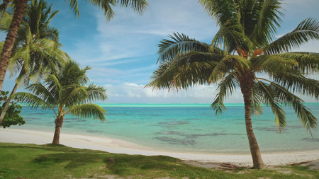Stunning tropical Aitutaki island with palm trees, white sand, turquoise ocean water and blue sky at Cook Islands, South Pacific. Copy space for text