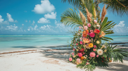 Experience the serenity of a tropical beach adorned with a vibrant floral arrangement against a backdrop of clear blue waters and fluffy clouds.