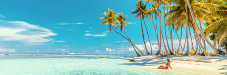 Beach suntan bikini woman sunbathing lying in ocean drinking tropical drink. Travel vacation paradise banner panorama background copy space on blue sky