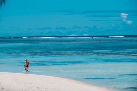 Beautiful daylight view from beach line to blue sea and waves, white sands. Grand Port District, Mauritius island