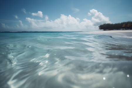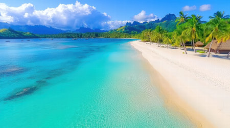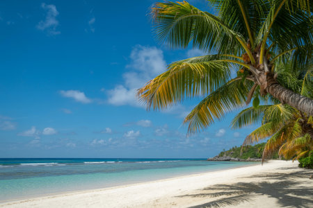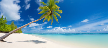 Tropical white sand beach with calm turquoise water and palm trees under blue sky, serene atmosphere for summer travel, hotel, resort, family vacation