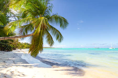 Coconut palm tree at sunny day with calm Atlantic ocean and white sandy beach, Dominican republic