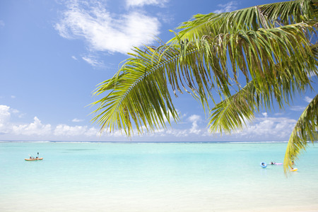 View of palm trees and seascape, Cook Islands, South Pacific. Copy space for text