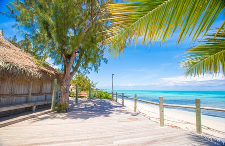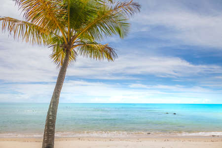Beautiful beach with white sand, turquoise ocean, blue sky with clouds and palm tree over the water