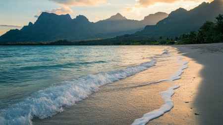 Experience a tranquil tropical paradise with palm trees swaying gently in the breeze, framed by majestic mountains and warm golden sunlight.