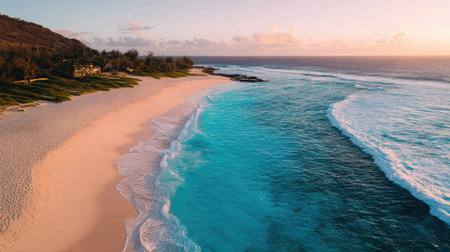 Experience the tranquil beauty of a secluded beach at sunset, where gentle waves meet soft sand against a backdrop of lush greenery and vibrant colors.