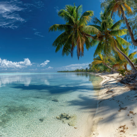Experience the tranquility of a serene tropical beach surrounded by lush palm trees and vibrant blue skies, perfect for relaxation and escape.