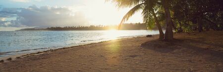 Tropical sunrise with coconut palm trees and ocean.