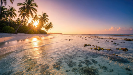 A tranquil beach scene displays palm trees silhouetted against a radiant sunset. The image features clear water reflecting the sky's colors, with textures of sand and rocks. The composition uses golden hour lighting to enhance the natural beauty, suitable for travel or environmental themes.