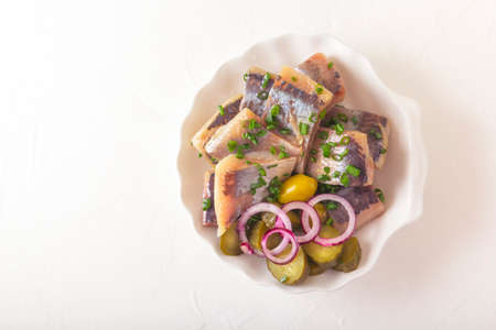 Salted herring with spice, herbs and onion on white plate on light stone background with copy space. Marinated sliced fish. Food with healthy unsaturated fats, flat lay