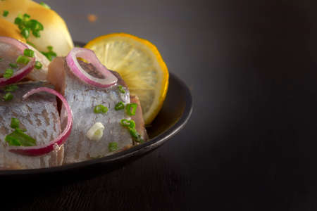 Pickled herring slices with red onion, fermented cucumber, potatoes, olives and lemon in a black plate on a dark wooden table. Copy space