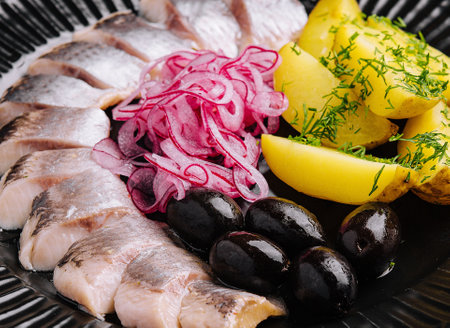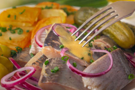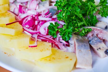 Close up of tasty marinated herring with potatoes and onions in plate
