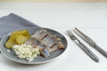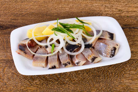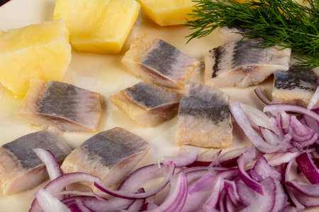 Dutch national appetizer, herring with onions.Tasty pieces of Icelandic herring with boiled potatoes and onions on the plate. National Icelandic snack Fat herring.