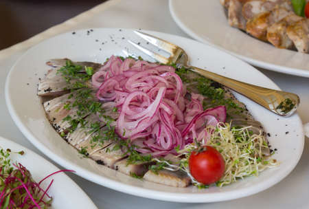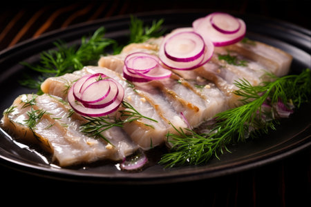 Sliced herring with red onion and dill on a white plate