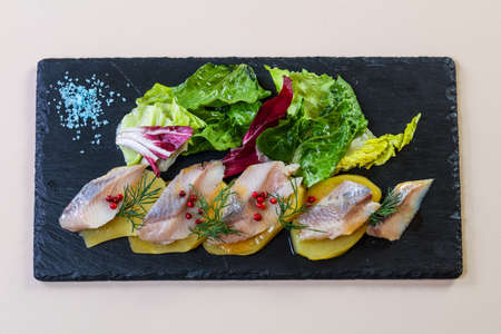 Fillet of a marinated light-salted herring with greens
