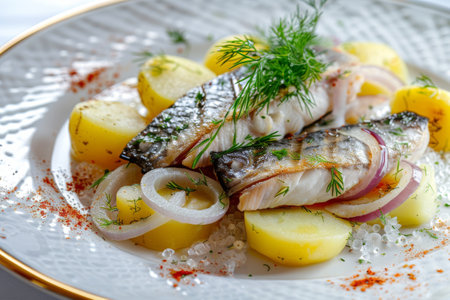 Salted Soused Herring, Raw Marinated Fish Fillet, Onion Rings and Boiled Diced Potato Decorated with Green Dill Closeup, Generative AI Illustration