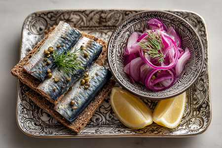 Savor a delicious assortment of smoked fish arranged on slices of rye bread, complemented by creamy butter, tangy pickled onions, and crunchy pickles. Perfect for a cozy gathering.