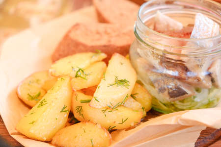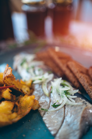 fresh marinated herring fish with potato and brown bread and onion in restaurant