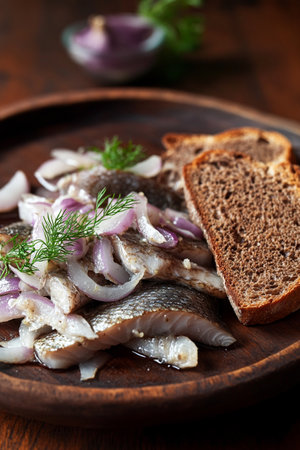 Rustic marinated herring served with onions, dill, and fresh bread on a wooden plate