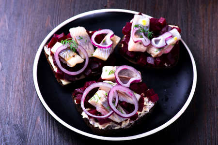 Sandwiches with herring and beetroot on the plate