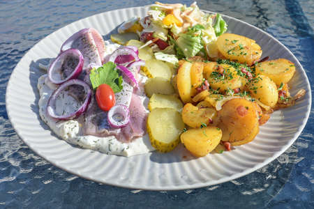 Matjes or soused herring in apple cream sauce with onions, fried potatoes, pickles and salad on a plate in an outdoor restaurant on a sunny summer day, selected focus, narrow depth of field