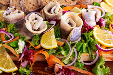 Traditional snacks salted herring with vegetables, onion, lemon, yellow lime and bread.