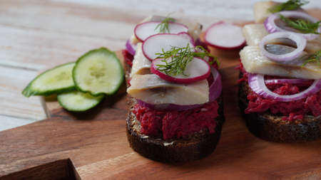 Danish open sandwich Smorrebrod on dark rye bread with herring, salmon, beetroot, red onions, and radish