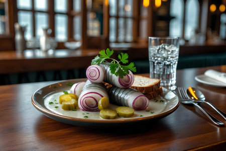 AI Generated. Seafood Breakfast Delight Featuring Rolled Herring with Onions and Pickles