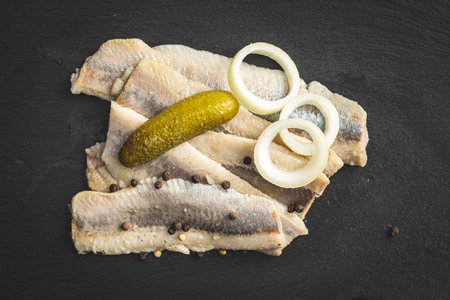 Dutch herring with onion and pickled cucumber. Selective focus.
