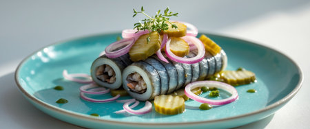 AI Generated. Seafood Dish with Rolled Herring Onions and Pickles on Turquoise Plate