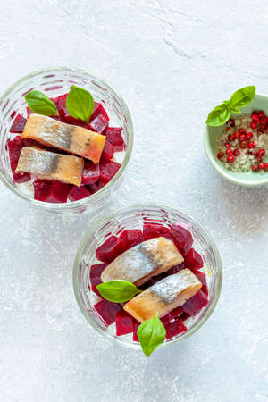Smoked hering and red beet salad served in glass bowls