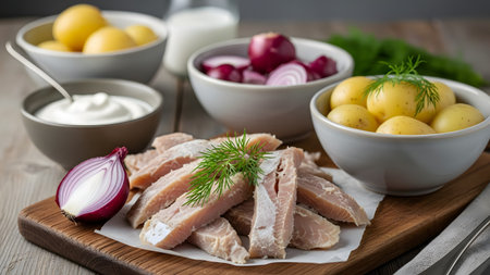 Slices of raw or pickled fish fillets are displayed on a wooden board alongside bowls of boiled potatoes, red onions, and sour cream. Fresh dill garnishes the ingredients, creating a setup for a traditional meal. The composition focuses on fresh, healthy food components on a wooden table.