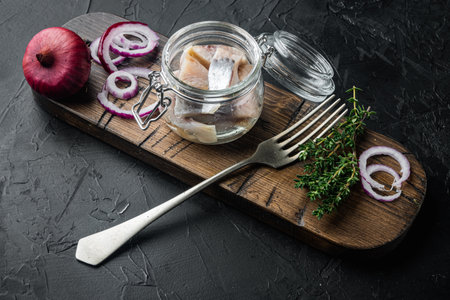 Canned Herring, fish preserves set, in glass jar, on black wooden table background, top view flat lay, with copyspace and space for text