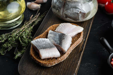 Atlantic wild herring, Pickled Canned fish preserves set, on wooden cutting board, on black background with herbs and ingredients