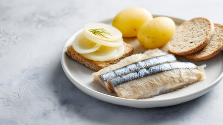 Traditional Swedish surströmming, fermented herring served with boiled potatoes, bread, and onion slices, arranged on a ceramic plate in Scandinavian rustic style.