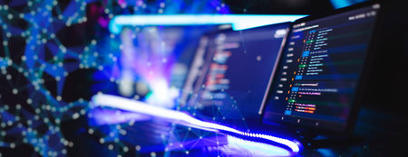 Writing programming functions on laptop. Big data and Internet of things trend. software development. Internet security hack