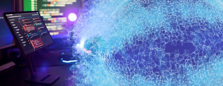 Software development company office. Database bits access stream visualization. Programming code abstract