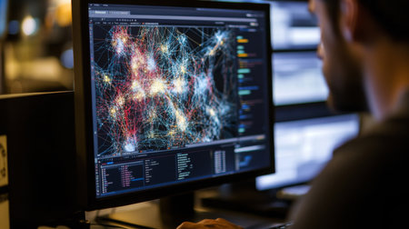 An intricate AI brain map with colorful neural networks is displayed on a computer screen, symbolizing advanced machine learning processes
