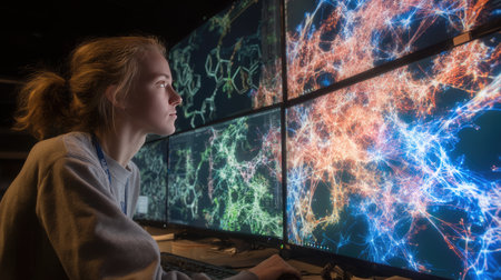 A young woman deeply engaged in data analysis at a modern workstation, surrounded by multiple vibrant screens displaying intricate digital visuals.