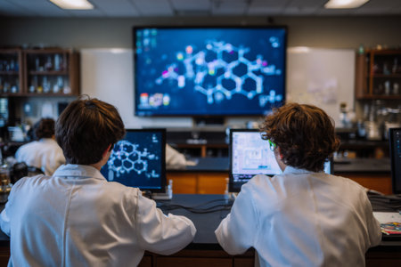 Two students in lab coats sit at a table in a chemistry lab, focused on their computers. An interactive display shows molecular structures experience behind them, enhancing their learning.