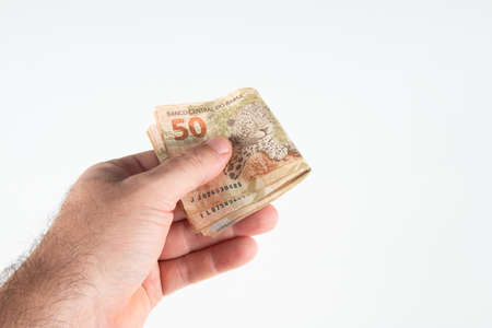 Brazilian money. Hand holding 50 reais banknotes. Brazilian finance concept..