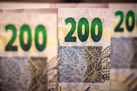 Cassilandia, Mato Grosso do Sul, Brazil - 2020 12 23: Macro view details of the new two hundred reais Brazilian banknote that went into circulation with selective focus