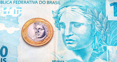 Real (BRL) - Money from Brazil. Money, Reais, Brazilian Real, Brazil. One Real coin in close up on a brazilian banknotes.