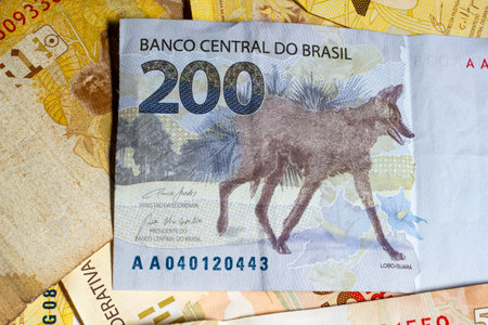 banknotes of money from brazil in the values ​​of 100 and 200 reais, wolf guará