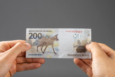 Hands holding Brazilian real notes, Brazil BRL banknote, Brazilian currency, economy and business.