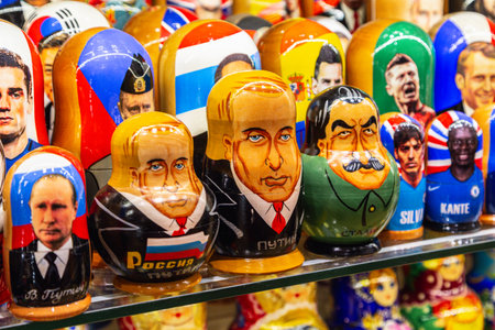 MOSCOW, RUSSIA - JANUARY 2, 2022: Matryoshka dolls depicting Russian President Vladimir Putin, Stalin in a souvenir shop