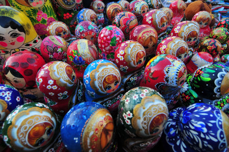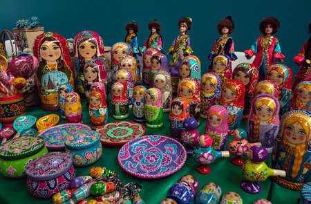 Moscow, June 08, 2018. Central market.Background of colorful Russian dolls on the market.Russian traditional Matryoshka souvenirs at the fair