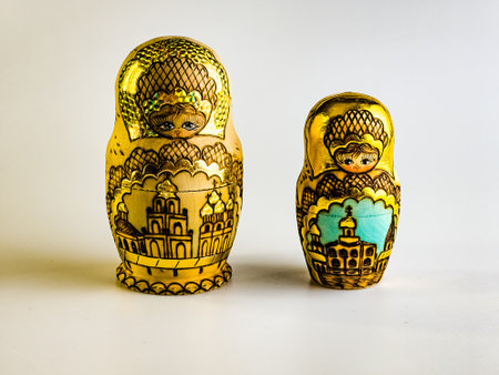 Two nesting dolls on a white background. Gold color with Orthodox houses.