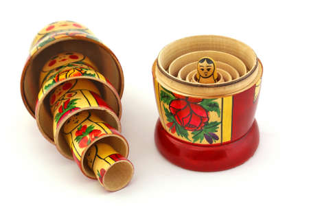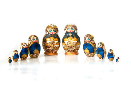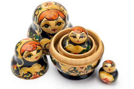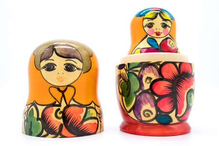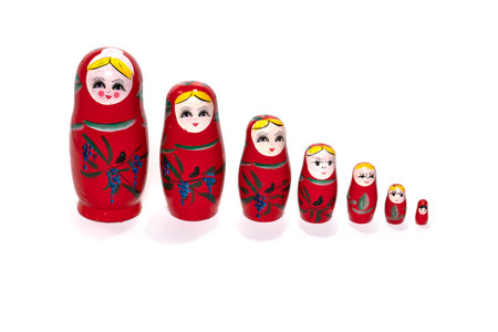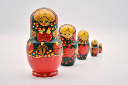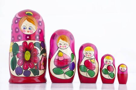 Group of Russian nesting dolls (also named as Matrioshka) isolated over white background. Wooden doll souvenir.