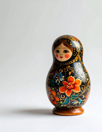 A beautifully hand-painted Russian matryoshka doll stands against a clean white background. Its intricate floral designs and warm expression hint at the generations of tradition and the hidden surprises held within its layers, a symbol of family and heritage.